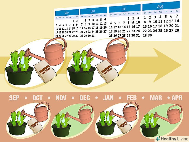 - Тільки використовуйте приблизно 1/3 або 1/2 добрив, які рекомендуються на етикетці. Так як кактуси в природній обстановці ростуть у відносно низькій живильному навколишньому середовищі, їм не треба багато поживних речовин для здорового зростання. [6]