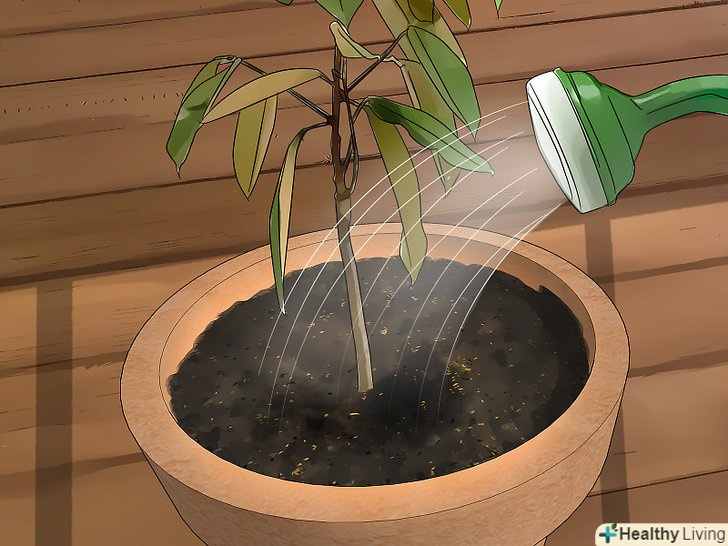 Поливайте дуріан кожен день. щодня поливайте його не менше 4-6 літрами води. Розподіліть цю кількість між вранці і другою половиною дня. [14]- Коли на дереві з'являться фрукти — а це трапиться приблизно через рік після посадки — збільште цю кількість до 6-8 л.