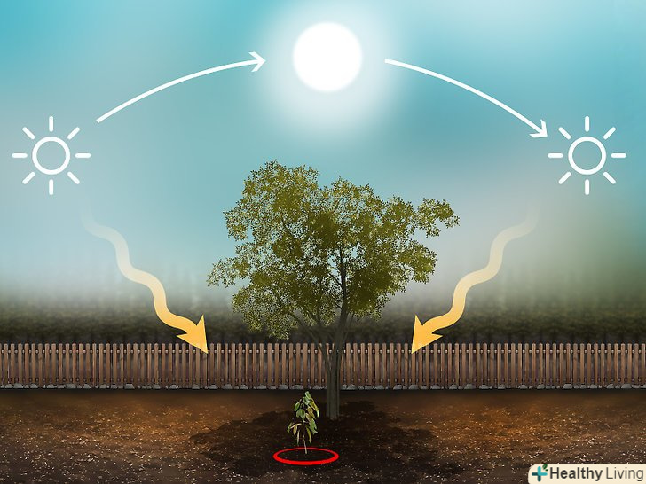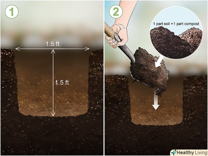 Вирийте яму глибиною 46 см і змішайте землю з компостом. виройте яму глибиною і діаметром 46 см там, де плануєте посадити насіння. Змішайте землю з компостом у співвідношенні 1:1 і заповніть яму цією сумішшю. [5]- Так Ви забезпечите дерево добре дренованим органічним грунтом.