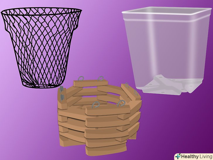Якщо орхідея невелика, виберіть для неї тісний горщик. більшість орхідей краще ростуть, коли їх коріння затиснуті. Підберіть для орхідеї маленький горщик, переконавшись, що в ньому досить дренажних отворів. Не використовуйте декоративні глазуровані горщики, так як глазур шкідлива для орхідей. Пам'ятайте, що надмірний полив-ворог орхідей. Деякі орхідеї, такі як Цимбідіум, вимагають більш витягнутих горщиків, щоб вмістити їх довгу кореневу систему. Наступні типи горщиків будуть вдалою заміною традиційним глиняним горщикам (це цілком прийнятно, і більшість любителів орхідей воліють саме їх):- Сітчасті горщики складаються з дротяної сіточки, що дозволяє коріння дихати. Такі горщики можна підвішувати для кращого доступу сонячного світла.