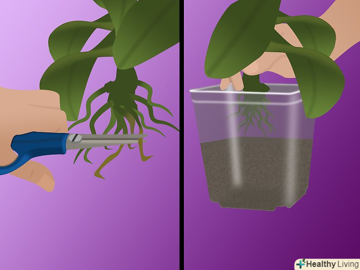 Посадіть орхідею. вийміть рослину з колишнього горщика, при цьому обрізавши всі гнилі або мертві коріння. Розправте коріння рослини перед посадкою, якщо буде потрібно. [2] сама зріла частина коренів повинна бути ближче до днища горщика, а більш молоді коріння — до його стінок. Насипте трохи горшечной суміші, щоб вона ледь прикривала кореневу систему.