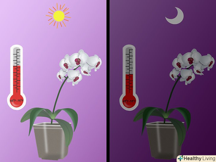 Створіть відповідну температуру для вашої орхідеї. більшість орхідей виростають в тропіках, тобто їм потрібно багато повітря, велика кількість світла і 12-ти годинний день (365 днів на рік). Температура (в залежності від виду орхідеї) повинна варіюватися від 18 до 24 °С.- Якщо температура вночі помітно нижче, ніж вдень, орхідея буде давати нові нирки, особливо восени і взимку. [5]