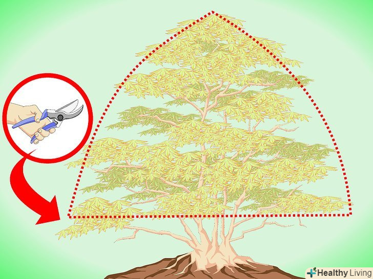 Обрізайте зрілі дерева, щоб надати їм форму. іноді рослини обрізають для їх здоров'я, але в більшості випадків це робиться заради зовнішнього вигляду. Ви можете видаляти відмерлі або в'януть частини незалежно від віку. Обрізання недоречних або некрасивих гілок слід відкласти до того часу, коли клен дланевідний зможе придбати свою природну форму – зазвичай це у віці двох-трьох років.