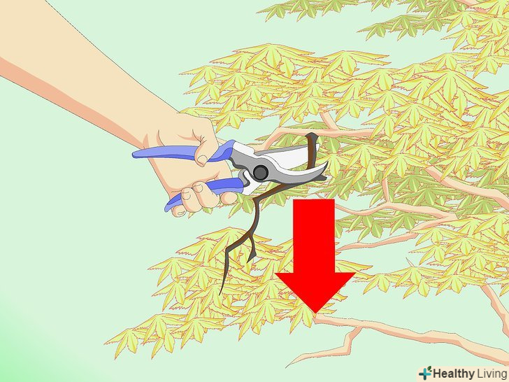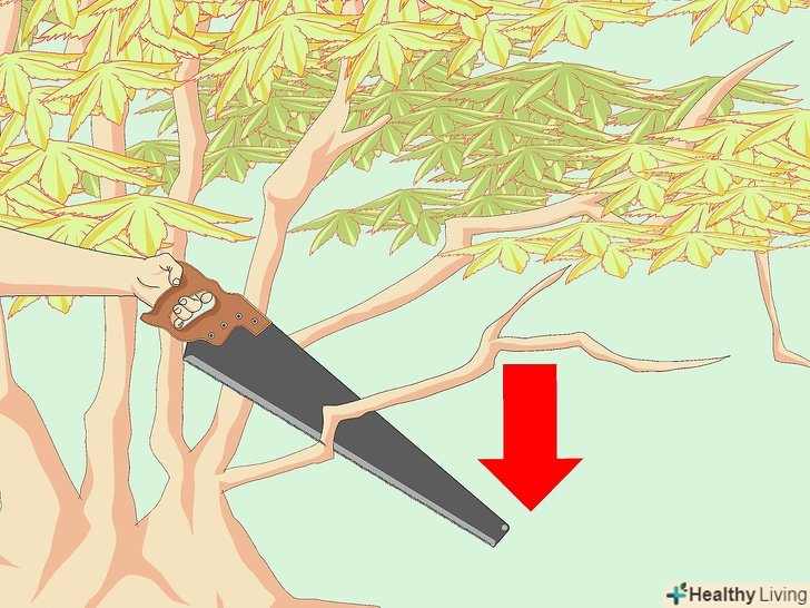 Видаляйте гілки, що ростуть в неправильному напрямку. у дереві, де гілки спрямовані вгору, це буде, наприклад, верхня гілка, що росте вниз. Для клена дланевидного, у якого гілки спрямовані в різні боки, часто зустрічається приклад – низько зростаюча гілка, що тягнеться прямо і вгору. Відпиляєте неправильно зростаючу гілку біля основи.- Зверніть увагу, що клени з гілками, що ростуть в різному напрямку, мають перекручені і вигнуті гілки, які не повинні виглядати рівно. Якщо вони не заважають іншим гілкам, їх не потрібно прибирати.