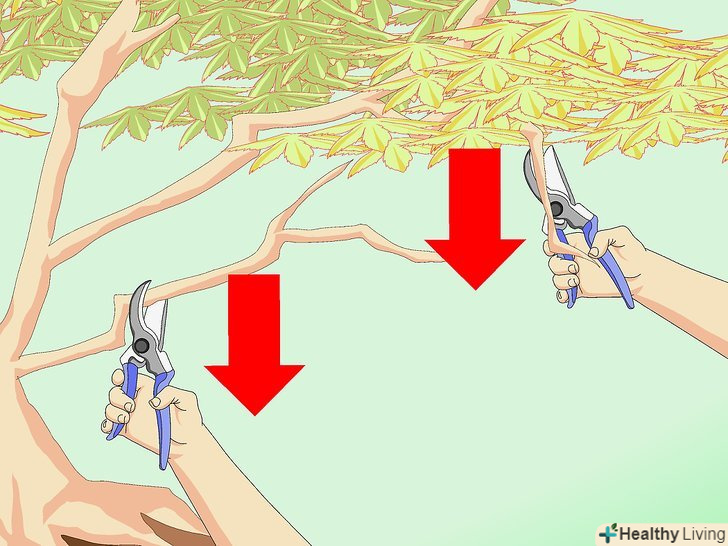 Обрізайте пагони вибірково. на цих деревах є «протилежні пагони» або «протилежні гілки» - тобто від великих гілок проростають відразу дві маленькі гілки. У підсумку виходить гілка у формі "Y", і з центру виходить ще одна гілка. Видаліть цю центральну гілку, щоб у вас вийшла нормальна форма «Y». Обрізайте якомога ближче до точки роздвоєння, залишаючи якомога менше центральної гілки. [3]