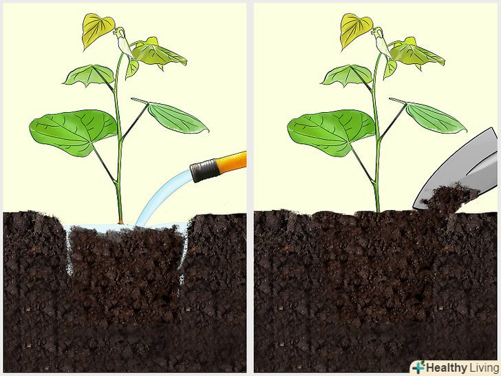 Наповніть отвір водою і рештою грунтом. використовуйте садовий шланг, щоб наповнити отвір водою. Зачекайте, поки коріння і навколишній грунт не вберуть воду перед наповненням отвору рештою грунтом, покриваючи коріння повністю. Ще раз ретельно полийте, щоб допомогти осісти грунті.