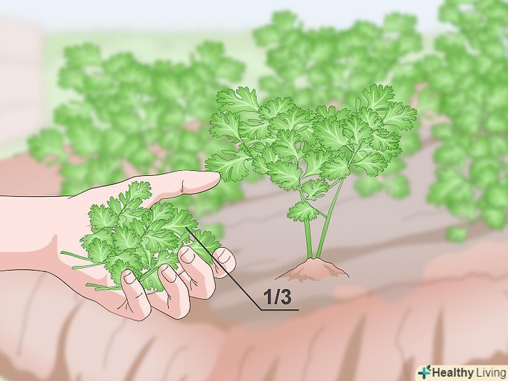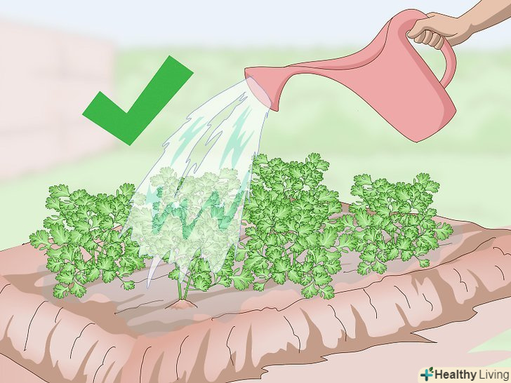 Підтримуйте грунт вологою. уникайте надмірного поливу кінзи, оскільки це може погубити рослину. Давайте рослині приблизно 2,5 см води в тиждень або таку кількість, яка буде постійно підтримувати вологість грунту. Спостерігайте за грунтом і поливайте рослину, якщо земля виглядає сухою. [15]