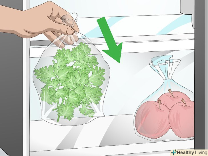 Зберігайте свіжу кінзу в холодильнику протягом тижня. загорніть свіжозібране гілочки кінзи або листя в чистий поліетиленовий пакет. Зберігайте пакет із зеленню в холодильнику у відділенні для овочів. Кінза залишатиметься свіжою і ароматною протягом тижня. [3]
