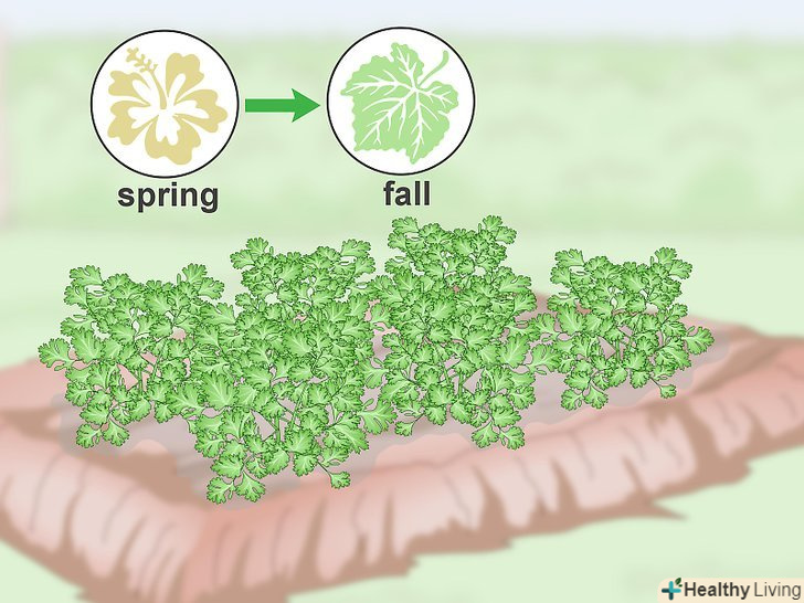Посадіть кінзу навесні або ранньою осінню. кінза добре росте в весняну і осінню погоду, тому ці два сезони підходять найкраще для її посадки. Постарайтеся не садити кінзу влітку — через спеку рослини розквітнуть передчасно. В цьому випадку цвітіння завершить цикл збору врожаю кінзи, і вам дістануться лише гіркі листя. [10]
