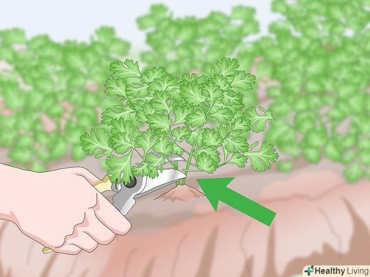 Зріжте гілочки, розташовані на рівні землі. гострими ножицями або секатором відріжте від рослини найбільші стебла з листям прямо над землею. Стебла повністю виросла кінзи зазвичай складають у висоту 15-30 см. не відрізайте стебла менше 15 см. [5]