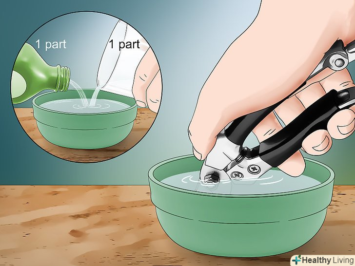 Продезінфікуйте секатор (і ножівку, якщо треба) перед обрізанням. змішайте медичний спирт з водою у співвідношенні 1:1. Занурте лезо в розчин або змочіть в ньому чисту ганчірку і протріть лезо. Якщо ж ви вже давненько не користувалися лезом, замочіть його в розчині приблизно на 10 хвилин. Після цього дайте йому висохнути на повітрі. [5]- Розчин також можна приготувати з 1 частини відбілювача і 9 частин води.