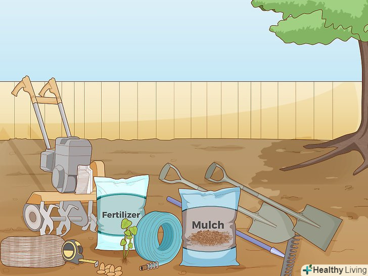 Купуйте садове обладнання та приладдя. вам знадобляться Насіння, цибулини або пророслі саджанці. Все це можна вибрати з каталогу, купити в інтернеті або в місцевому розпліднику. Вам також потрібно з'ясувати, яке садове обладнання та приладдя вам знадобляться, виходячи з того, який тип саду ви організовуєте, і які будуть його розміри. Прості ручні інструменти добре підійдуть для маленького садка, але якщо він буде більше ніж кілька квадратних метрів, тоді легше буде працювати механізмами побільше. Подумайте про те, щоб придбати наступні приналежності:- Насіння, цибулини або саджанці. Розплідники мають відмінний вибір, так що ви можете попросити їх персонал підібрати вам рослини для вашого регіону. Насіння зазвичай проростає в приміщенні, а після місяця-двох погода стає тепліше і приходить час їх висаджувати. У той час як Саджанці і цибулини можуть бути висаджені відразу ж після покупки.
