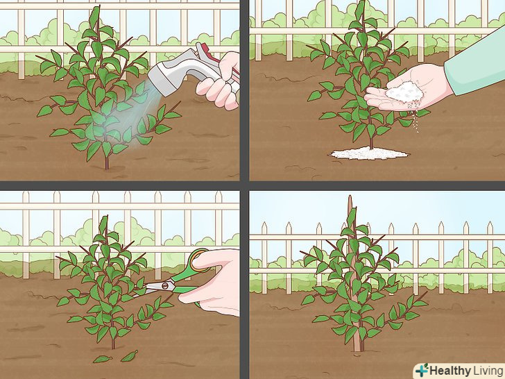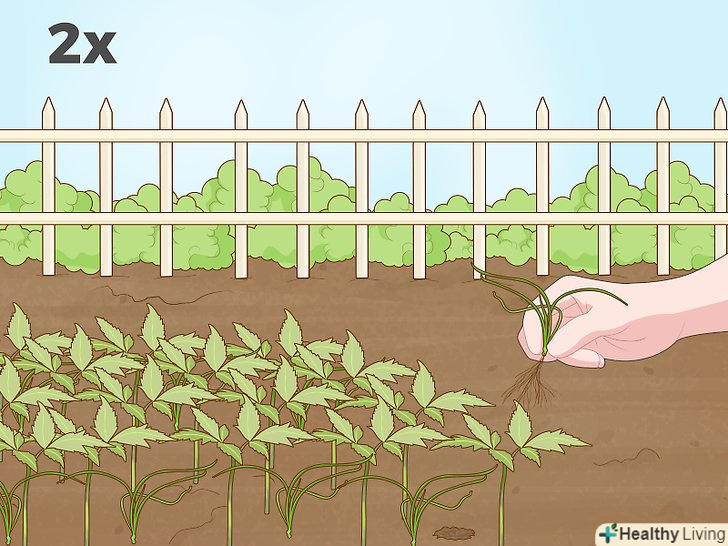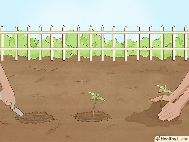 Викопайте лунки і посадіть саджанці. використовуйте лопату, щоб викопати яму потрібної глибини, і переконайтеся, що залишили їм достатньо простору один від одного, щоб у кожної рослини вистачало місця для зростання. Помістіть саджанці в землю і засипте верхнім шаром грунту. Завершіть шаром мульчі, якщо потрібно.