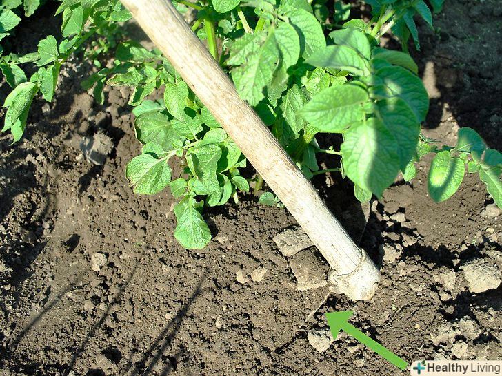 Візьміть сапку і зберіть землю в насипу навколо стебел картоплі. землі повинно бути стільки, щоб над насипом стирчало всього 5 см стебла. Таким чином, на рослині залишиться достатньо Листя для зростання, і на бульби не буде потрапляти сонячне світло, через якого картопля може позеленіти і стати отруйним. Скористайтеся цією можливістю і приберіть всі бур'яни і сміття, який з'явився в результаті посадки. [2]