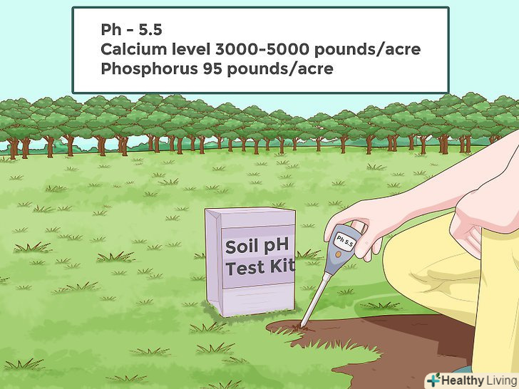 Оцініть і протестуйте грунт. грунт повинен бути суглинистой і вологою, з хорошим дренажем. Уникайте болотистої грунту і твердої глини. Якщо у вас вже є ділянка для посадки на прикметі, візьміть проби грунту з різних місць цієї території в рівних порціях і змішайте їх в одному пластиковому відрі. Зробіть аналіз грунту в лабораторії або в університеті. [14] у магазинах для садівництва продаються спеціальні набори для самостійної перевірки рівня рН грунту, проте протестувати грунт на склад кальцію і фосфору може бути набагато складніше. Незважаючи на різні думки з приводу найбільш підходящої грунту, орієнтуйтеся на показники рН від 4,5 до 5,5 (кислі грунти), кальцію – близько 0,35 кг на квадратний метр, фосфору (p) – як мінімум 0,01 кг на квадратний метр землі. [15]- Грунт з правильним рівнем вологості повинна прилипати до рук або легко скочуватися в грудку. [16]