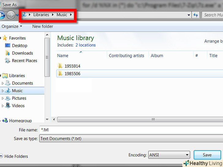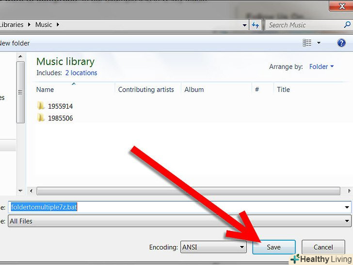 Відкрийте розташування тієї папки, яку хочете стиснути.у нашому випадку це C:\My Music.- Створіть свій пакетний файл, при збереженні встановивши тип файлу на "всі файли «і назвавши його чимось на зразок»Папка для декількох архівів 7z.bat".зверніть увагу на розширення файлу, яке в нашому випадку .bat. Переконайтеся, що при збереженні ви не встановили тип файлу на «текстовий документ».