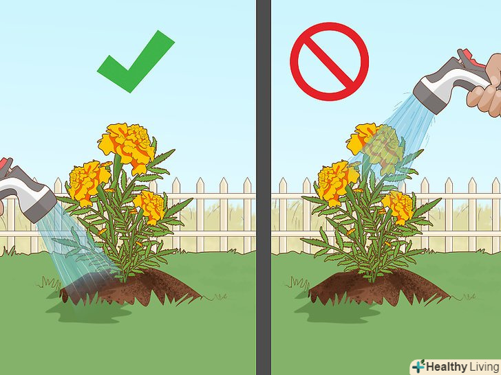 Поливайте чорнобривці знизу, а не зверху. поливання чорнобривців зверху може пошкодити листя і квіти, це навіть може привести до загнивання. Намагайтеся поливати чорнобривці біля основи рослини.- Намагайтеся не поливати чорнобривці з садового шланга. Напір води зі шланга Змиє верхній шар грунту.