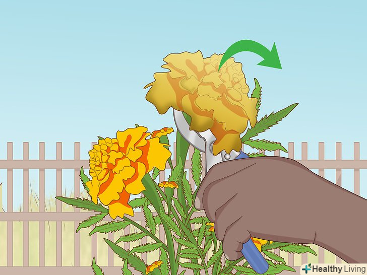 Видаляйте відцвілі суцвіття. видалення відцвілих суцвіть з квітучої рослини – один з етапів вирощування квітів. Це не є обов'язковим кроком, але видалення відцвілих суцвіть продовжить цвітіння чорнобривців.- Щоб чорнобривці росли компактними, прищипуйте їх, видаляючи небажані відростки. [11]