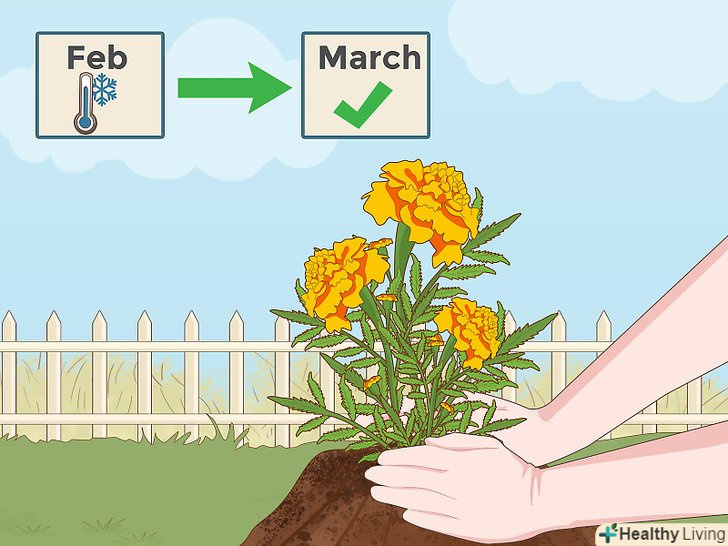 З'ясуйте, коли треба висаджувати чорнобривці. незважаючи на те, що чорнобривці є невибагливими рослинами, вони не переживуть холодну погоду. Садіть чорнобривці після того, як закінчаться останні заморозки.- Якщо можливо, висаджуйте чорнобривці в похмурий день або вранці, так рослини не будуть схильні до дії спеки при пересадці, пересадочний шок буде пом'якшений.