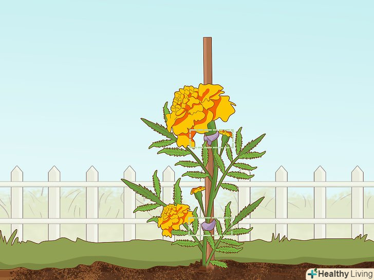 Поставте до чорнобривців кілочки. більшість видів чорнобривців низькі і ростуть у землі, але якщо ви вибрали високий сорт, наприклад, африканські чорнобривці, можливо, вам доведеться зробити для них опору у вигляді кілочків. Візьміть кілочки висотою 60 см, прив'яжіть чорнобривці до кілочка за допомогою м'якої, що тягнеться тканини. (Старі капронові колготки прекрасно впораються з цим завданням!) [12]