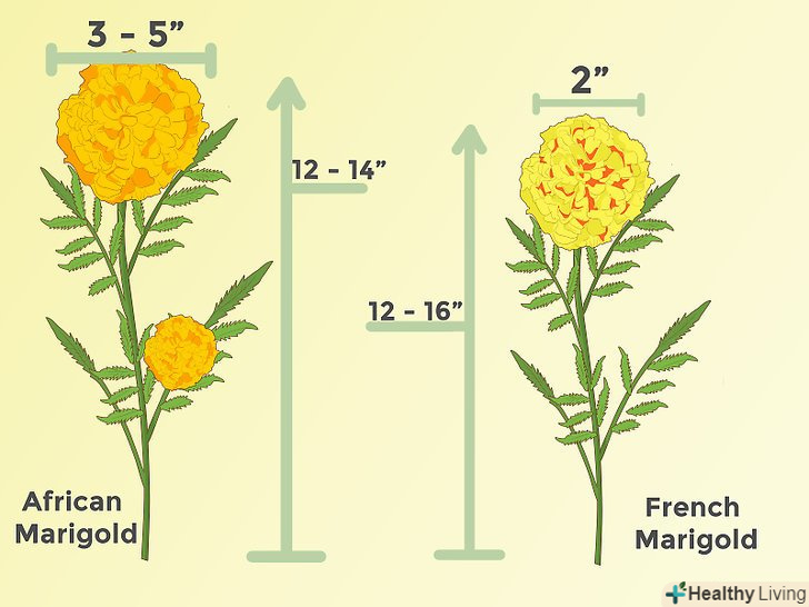 Визначте, якого розміру чорнобривці ви хочете вирощувати. існують чотири основні групи видів чорнобривців, і всередині кожного з них є різні варіанти кольорів і розмірів. [4]- Африканські чорнобривці бувають двох видів: "з великими квітками" і " високі."Чорнобривці з великими квітками зазвичай невисокі, 30-35 см, але, згідно з назвою, мають дуже великі квітки, до 9 см в діаметрі. У високих африканських чорнобривців квітки невеликі, але самі рослини можуть вирости до 90 см у висоту. Обидва види зазвичай цвітуть помаранчевими або жовтими квітами. Африканські чорнобривці ще "американськими".