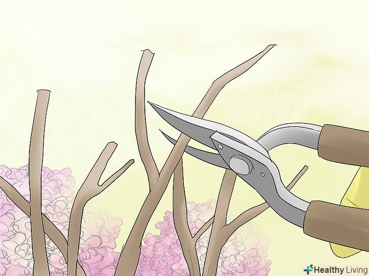 Залиште кілька старих опорних гілок, які будуть підтримувати рослину. квіти гортензії зазвичай важкі, тому не перестарайтеся при обрізанні старих пагонів. Залиште непошкодженою хорошу мережу гілок, щоб вони не ламалися під вагою квітів. [3]