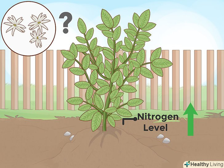 Досягніть, щоб жасмин знову зацвів. якщо ваш жасмин дає пишну зелень, але не цвіте, можливо, в грунті занадто багато азоту через надлишок добрив. Інша можлива причина-рослина відчуває стрес і-за недостатнього або надмірного поливу, занадто високих або низьких температур, спертого повітря або нестачі світла.- Жасмину, що росте в приміщенні, також необхідний період спокою, який настає восени. [10]