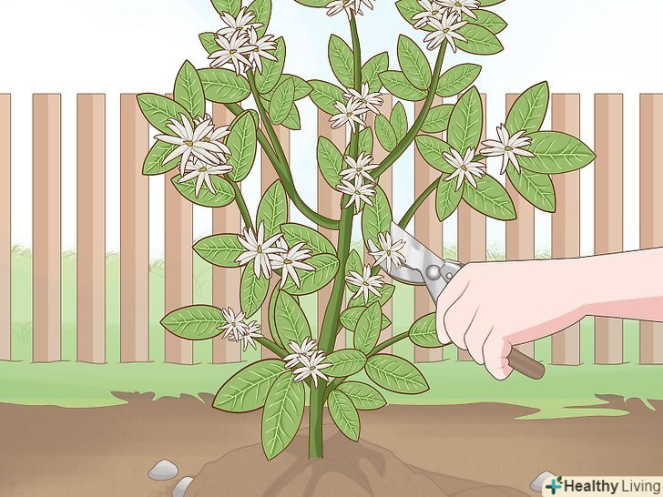 Зріжте жасмин, для вази. Лоза або кущ жасмину в сезон дають дуже багато квітів, які можна використовувати в букетах. За допомогою секаторів зріжте рясно квітучі гілки з листям. Відразу ж поставте їх у воду, щоб зберегти свіжими. [11]