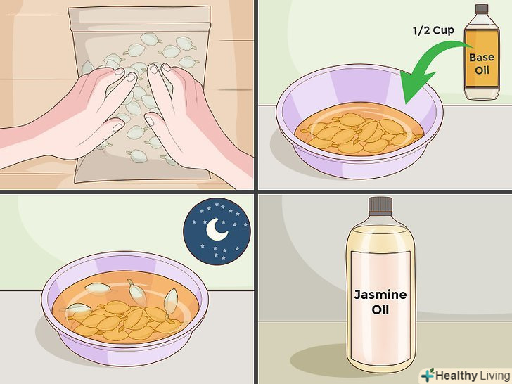 Використовуйте бутони жасмину для виготовлення масла. якщо ви хочете використовувати сильний солодкий аромат жасмину в якості духів, то можна зробити масло з його бутонів. Вам буде потрібно скляна банка з тугою кришкою і базове масло на ваш розсуд. Підійдуть мигдалеве, оливкова, касторове масло або масло жожоба. [14] для приготування масла дотримуйтесь нижчезазначених процедур.- Зберіть вранці 1/4 склянки свіжих бутонів .