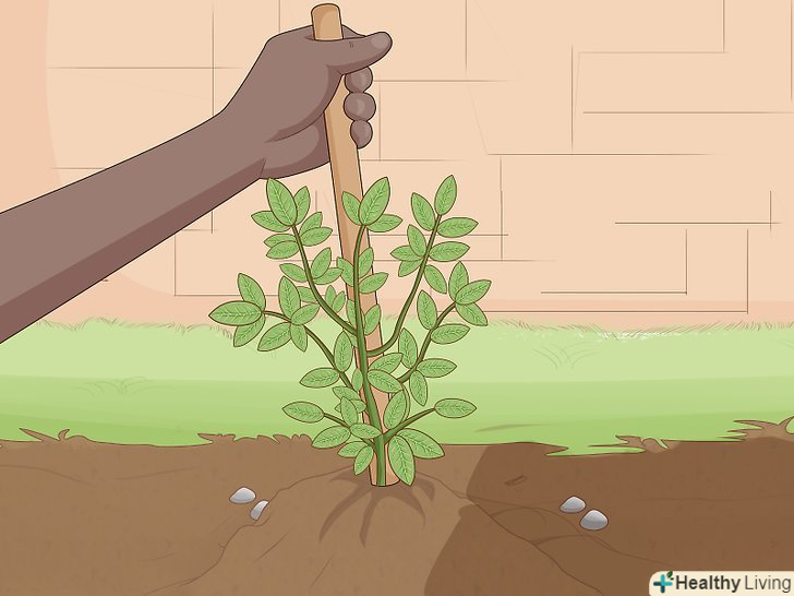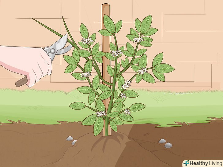 Забезпечте опору кучерявому жасмину. багато різновидів жасмину потребують опори, щоб рости сильними і здоровими. Розмістіть високий кілочок або трельяж в декількох сантиметрах від основи жасмину, і обережно намотуйте рослину на опору в міру його зростання. Зрештою воно саме почне обплітати опору. Якщо ви посадили жасмин біля стіни або паркану, направляйте його вгору, поки він сам не продовжить рости в цьому напрямку. [3]- Щоб жасмин зміцнився на опорі, спочатку можна використовувати нитку або мотузку, щоб нетуго підв'язати пагони до опори. Приберіть зав'язки, коли лоза сама обовьется навколо опори. [4]