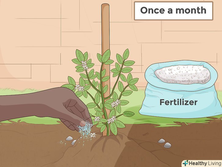 Удобрюйте жасмин раз на місяць. у сезон зростання щомісячне внесення добрива змусить його продовжувати цвісти. Розсипте збалансоване водорозчинне добриво навколо основи жасмину або використовуйте добриво в рідкій формі (вже розведене у воді).- В якості альтернативи можна внести шар компосту глибиною 2-3 см в грунт навколо підстави рослини. Будьте обережні, щоб не пошкодити коріння.