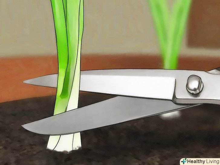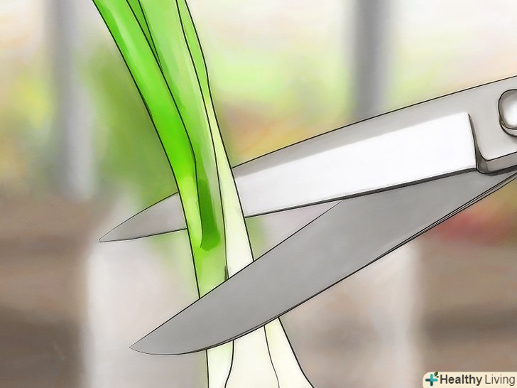 - Якщо ви хочете використовувати тільки зелену частину цибулі, а не білу, яка знаходиться близько до коріння, ви можете використовувати ножиці, щоб просто відрізати зелені вершки. Залиште 2-5 см для росту. Лук буде продовжувати рости, і ви зможете збирати Зелений урожай знову, як тільки він буде досягать15-20 см в довжину. Зверніть увагу на те, що вони придбають більш сильний смак, так як рослина дозріває.