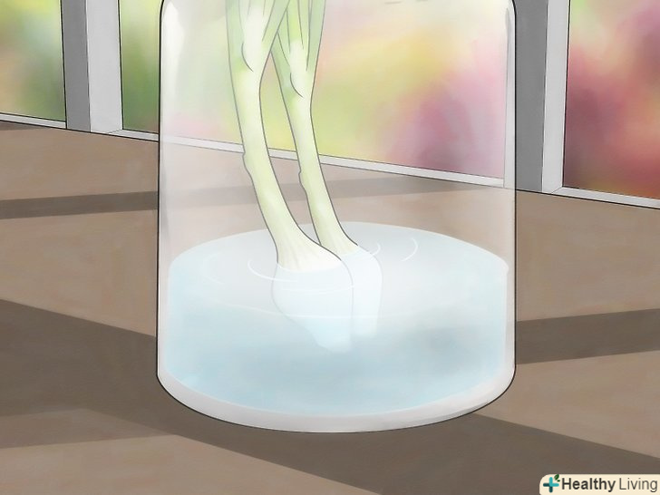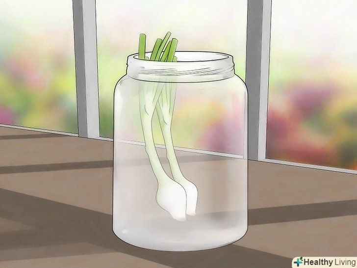Покладіть їх корінням вниз в скляну банку. будь-який тип чистих скляних банок підійде. Просто переконайтеся, що скло чисте, а не кольорове, щоб сонячні промені могли легко дістатися до лука всередині. Покладіть всередину стільки зеленої цибулі, скільки хочете – тільки переконайтеся, що коріння звернені вниз, так, щоб зелень виросла з банки.- Не використовуйте пластиковий стаканчик, так як пластик може проникати в воду і впливати на смак цибулі.