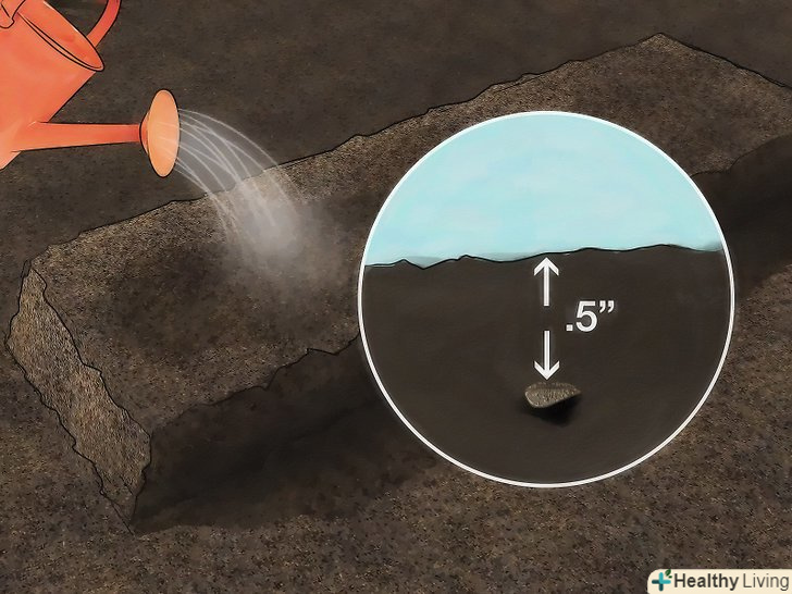 Посадіть насіння або саджанці. як тільки грунт буде готова, приблизно за 4 тижні до останнього морозу, пора садити заготовлені насіння або саджанці. Якщо у вас насіння, густо посійте їх приблизно на 1 см в глибину в ряд на відстані 30 см один від одного. Якщо у вас саджанці, посадіть їх коренем вниз на відстані 5 см один від одного і 2 см в глибину рядами, віддаленими один від одного на 30 см.ретельно полийте грядку.- Насіння цибулі проростає, коли температура грунту становить від 18 до 30 градусів за Цельсієм. Насіння цибулі, щоб прорости, може знадобитися близько місяця.