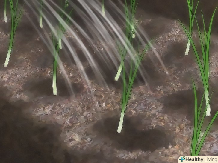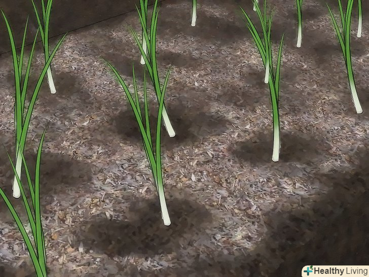 Замульчуйте грунт між саджанцями. покрийте грунт навколо розсади скошеною травою, сосновою соломою або тонкими шматочками кори. Це дозволить запобігти проростання бур'янів і підтримувати грунт рівномірно вологим.- Якщо ви вирощуєте зелену цибулю в горщику, можете пропустити цей крок, так як бур'яни не будуть проблемою, і ви можете легко контролювати рівень вологості.