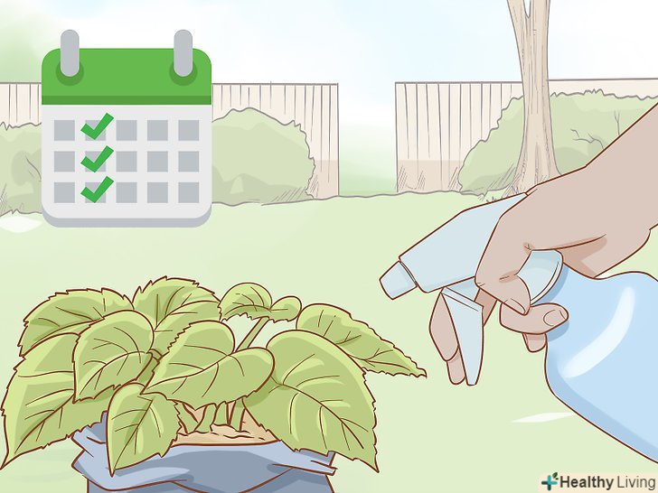 Обприскуйте уражені ділянки рослин вранці не частіше одного разу на тиждень. при захворюванні борошнистою росою обприскуйте рослини вранці, щоб потім Сонце висушувало вологу на листках. Часто поліпшення помітні вже після першого обприскування. [7]- Зачекайте хоча б тиждень після першого обприскування і використовуйте спрей повторно лише в тому випадку, якщо не помітите ніяких поліпшень на листках.