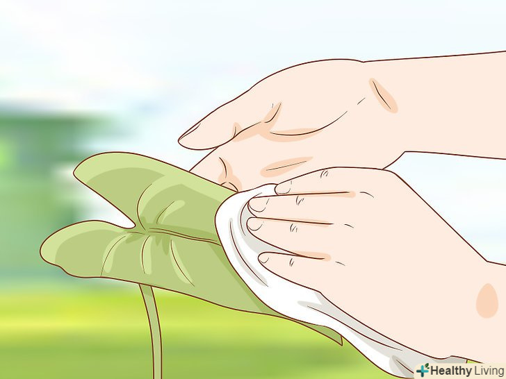 Витирайте листя чистою ганчіркою, щоб частково видалити борошнисту росу. перш ніж обприскувати заражені листя, протріть їх сухою чистою ганчіркою, щоб видалити частину грибка. Таким чином ви зменшите кількість борошнистої роси, яка потрапить в грунт разом з розчином. [8]- Можна також потерти заражені листя один об одного, щоб позбутися від грибка.
