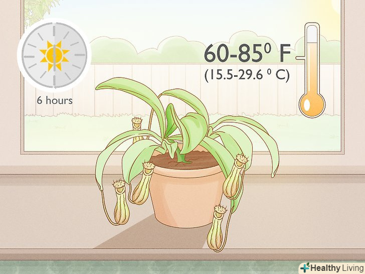 Поставте рослину в сонячному місці, що отримує, принаймні, шість годин прямого сонячного світла. Ідеальні температури в діапазоні 15.5 º C - 29.6 ° с.красива забарвлення м'ясоїдної рослини буде набагато інтенсивнішою, якщо рослина отримує пару годин яскравого, повного сонячного світла кожен день, але воно також буде рости досить добре в півтіні. Більшість людей вирощують комахоїдні рослини в теплиці або в тераріумі. Ви можете зробити недорогий варіант з використанням блюдця і пластикової пляшки; зріжте верхню частину пляшки і покладіть її догори дном над рослиною на блюдце. Сад підійде, коли він повторює точне середовище, в якому м'ясоїдні рослини ростуть природним чином.- Недостатнє освітлення є частою причиною загибелі комахоїдних рослин в доморощеному середовищі. Якщо у вас немає теплиці або вологого, сонячного простору для рослин, розгляньте можливість використання штучного освітлення. Освітлення з декількома холодними або теплими білими люмінесцентними лампами, розміщеними на відстані 30 см.від рослини, сприятимуть їх росту.