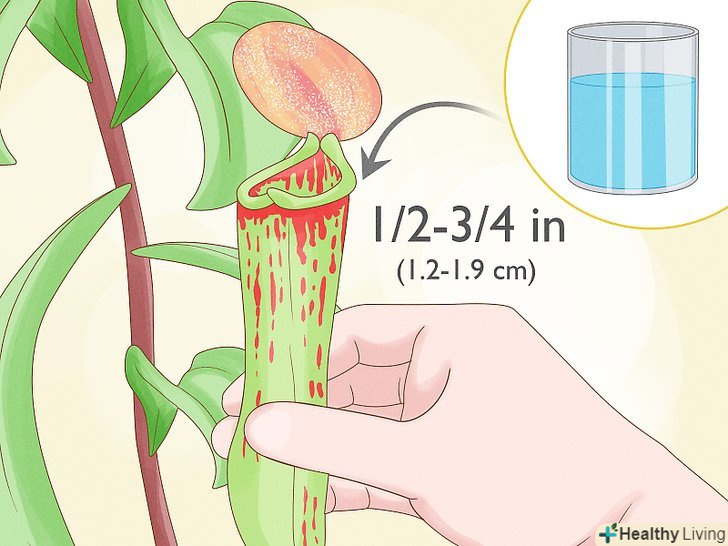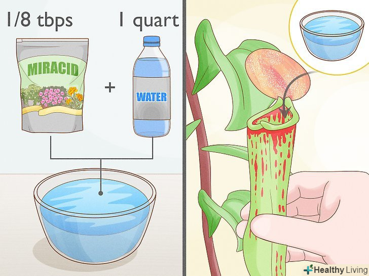 Годуйте рослину. якщо м'ясоїдні рослини ростуть десь без доступу до комах протягом тривалого періоду часу, ви можете додати кілька дрібних комах, таких як муха або тарган дорослому рослині. Тим не менш, це, як правило, не потрібно. Багато видів отримують вигоду від додавання невеликої кількості збалансованого розчинного добрива в "глечик" (наприклад Miracid, змішана 1/8 чайна ложка на літр води). Додайте цей розчин до "глечиків", поки вони не будуть заповнені на 3/4.