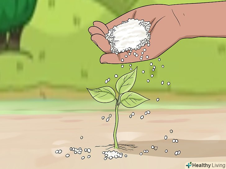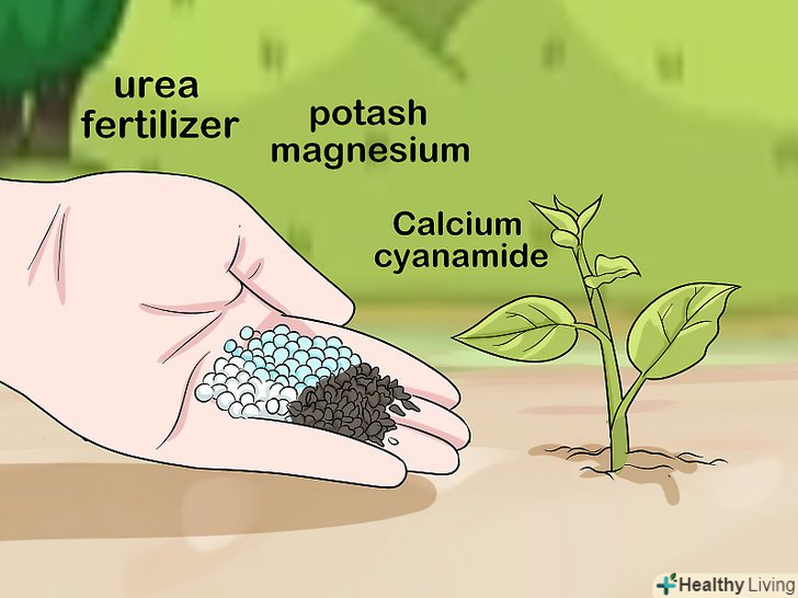 Розсипте добриво з сечовиною рівномірно по землі. внесіть добриво так само, як сечовину, рівномірно розсипавши її по землі. Потім полийте і перекопайте землю.- Сечовина не така щільна як інші добрива. Якщо ви вносите сечовину за допомогою розкидача і вам необхідно обробити велику площу землі, зменшіть відстань розкиду до 15 м, щоб вносити добриво більш рівномірно. [14]
