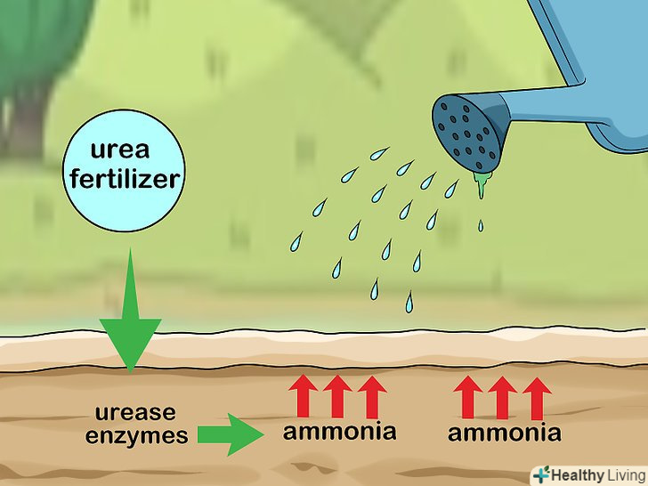Намочіть землю. перш ніж сечовина перетвориться в необхідний рослинам азот, вона спочатку стане газом аміаком. Оскільки гази можуть з легкістю покинути поверхню землі, вносите добриво в мокрий грунт, щоб сечовина вбралася в неї ще до початку хімічної реакції. Так в грунті залишиться більше аміаку.- Верхні 1,3 см землі повинні бути вологими, щоб утримати якомога більше аміаку. Полийте землю самі, внесіть сечовину перед дощем або протягом 48 годин після того, як на вашому городі повністю розтане сніг. [5]