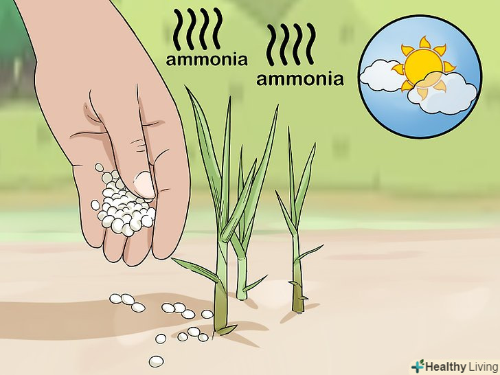 Удобрюйте злаки в нежаркий день. сечовину можна наносити безпосередньо на більшість злакових культур, але не робіть це при температурі вище 15 °C. Якщо внести добриво в теплий день, від рослини почне неприємно пахнути аміаком. [8]