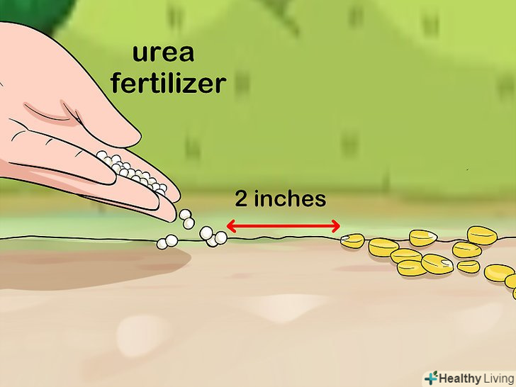 Удобрюйте кукурудзу тільки непрямим способом. для цього розсипте сечовину по землі, не менше ніж в 5 см від насіння. Прямий вплив сечовини може стати для насіння токсичним і сильно знизити врожайної кукурудзи. [9]
