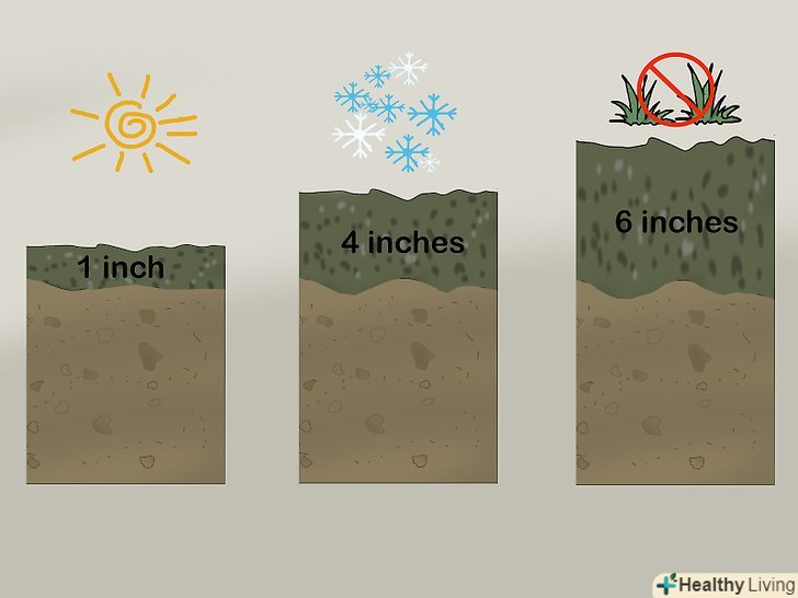 Граблями розрівняйте шар мульчі. за допомогою граблів розподіліть раніше підготовлені купи мульчі рівним шаром по поверхні землі. Якщо ви проводите весняне або літнє мульчування, створіть шар мульчі в 2,5-5 см по всій мульчируемой території. Якщо ви використовуєте неорганічний мульчирующий матеріал великої фракції, то його можна розподілити руками без застосування грабель. У міру необхідності підсипати собі лопатою додаткову кількість мульчі. [8]- Якщо ви проводите зимове мульчування або мульчуєте землю для захисту від бур'янів, можна створити шар товщиною в 10 см.