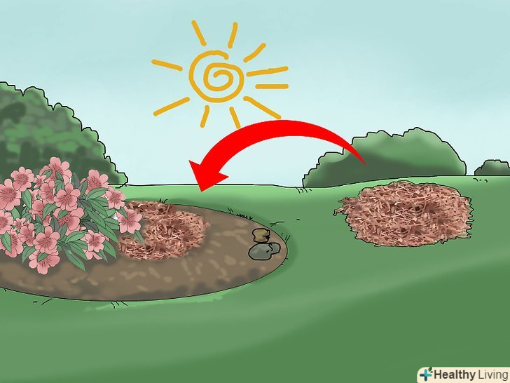 Лопатою розкладіть на землі квітника або грядки невеликі купки мульчі. спочатку насипте свіжу мульчу в тачку, щоб вам було простіше її транспортувати. Потім насипте лопатою невеликі купи мульчі там, де її потрібно додати. Як тільки підготуєте 3-4 невеликі купки, переходите до наступного кроку. [7]- Якщо висипати весь обсяг мульчі на одному місці, її шар може виявитися занадто товстим, через що коріння ваших рослин задихнуться.