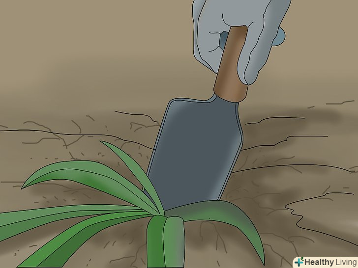 Прополіть бур'яни. скористайтеся Садовою лопатою, щоб викопати всі наявні бур'яни. Викорчовуйте бур'яни на достатній глибині, інакше вони можуть вирости заново із залишків коренів. Даний крок важливо виконати для того, щоб бур'яни не виросли під шаром мульчі. [4]- Якщо у вас є час, в якості альтернативи можна скористатися хімічним гербіцидом, який сам знищить бур'яни.