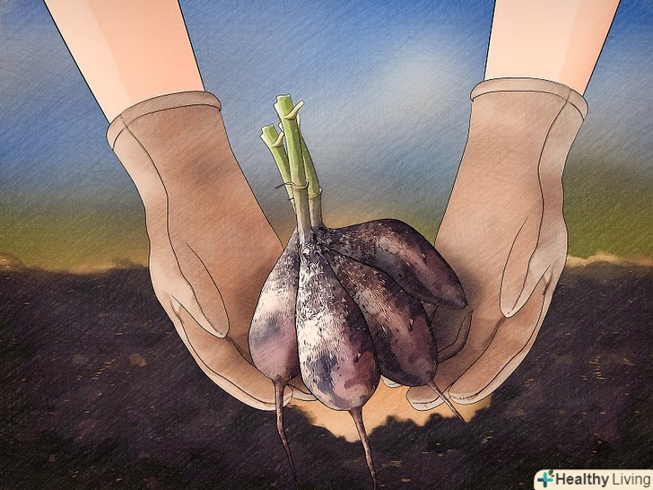 Розпушити землю біля бульб. для початку візьміть посадкову вилку і розпушити землю навколо бульб. Будьте обережні, щоб не вставити вилку занадто близько до стебла або занадто глибоко в землю. В іншому випадку можна случайте зачепити бульби і пошкодити їх. [2]- Струсіть виделкою, щоб прибрати землю.