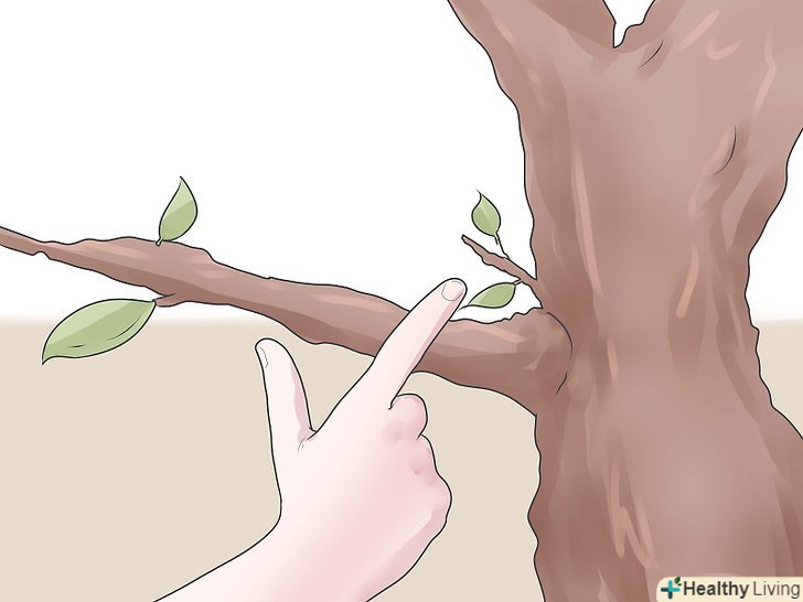 Протягом другого року усуньте негабаритні гілки. [2] на дереві може бути більше шести бічних гілок протягом другого року, але гілки, які будуть занадто товстими або великими, можуть конкурувати з центральним втечею і повинні бути видалені.- Видаліть гілку, роблячи зріз в тому місці, де вона переходить в стовбур дерева.