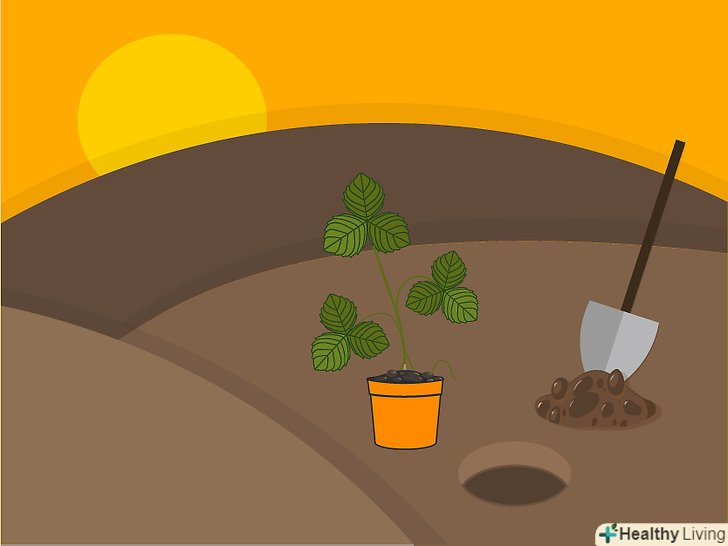 Пересадіть рослину з горщика в ямку. дістаньте суницю з горщика-будьте обережні, щоб не пошкодити коріння. Помістіть коріння в землю і присипте їх зверху грунтом. Після цього відразу ж полийте рослина. [10]- Присипте землею лише коріння. Товстий зелений стебло повинен залишитися над землею.