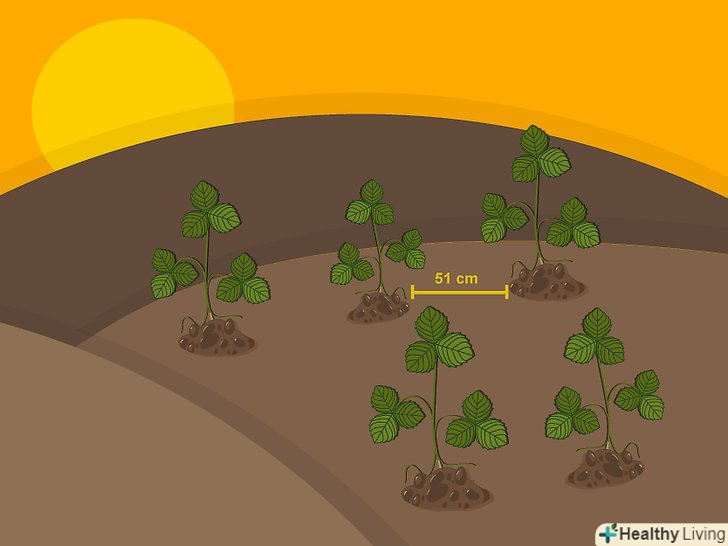 Посадіть пагони суниці на відстані 50 сантиметрів один від одного. якщо ви садите суницю в кілька рядів, відстань між ними має становити 1,2 метра. У цьому випадку у рослин буде достатньо місця для зростання. [11]